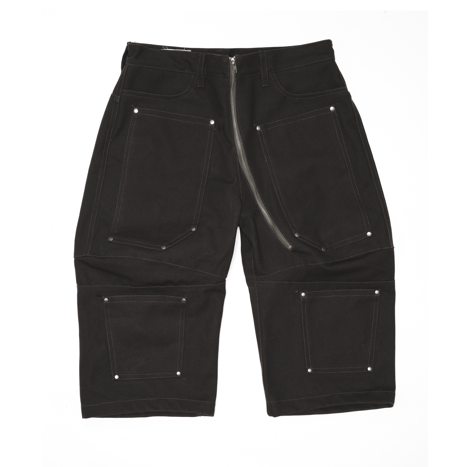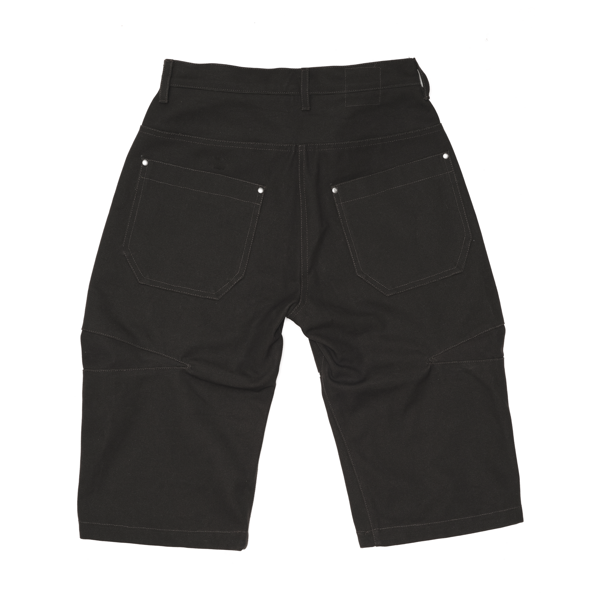 HEAVY WEIGHT FORREST GREEN CANVAS DOUBLE KNEE CAPRI PANTS. FEATURES CURVED ZIPPER, KNEE PANEL DETAIL AND METAL RIVETS.